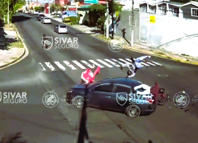 Un aparatoso accidente entre dos motociclistas y un auto en una calle de San Salvador quedó grabado por una cámara de seguridad. El video muestra el momento de la colisión, que hizo que los dos hombres salieran disparados violentamente de sus motos. Equipos de emergencia trasladaron a uno de losLEER MÁS