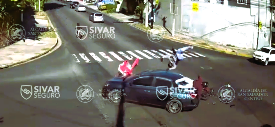 Un aparatoso accidente entre dos motociclistas y un auto en una calle de San Salvador quedó grabado por una cámara de seguridad. El video muestra el momento de la colisión, que hizo que los dos hombres salieran disparados violentamente de sus motos. Equipos de emergencia trasladaron a uno de los motociclistas a un centro médico, mientras que no se proporcionaron detalles sobre el estado del otro. El conductor del coche, aparentemente, buscó cambiar de vía sin hacer el alto correspondiente.
