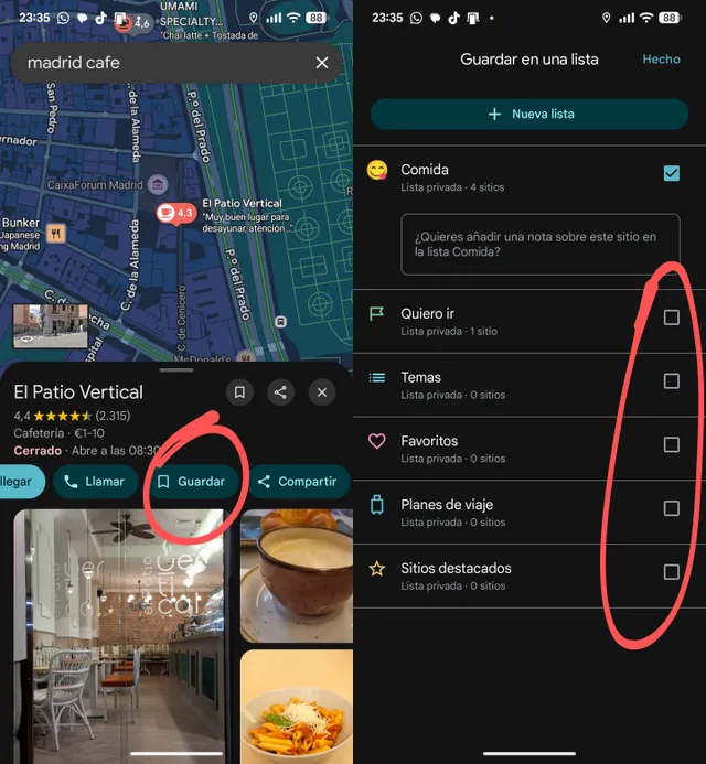 Guardar ubicaciones como favoritas: Cada vez que visitas un sitio que te gusta o descubres un lugar que quieres recordar para más adelante, puedes guardarlo como favorito. Basta con pulsar sobre la ubicación en el mapa, tocar Guardar y seleccionar una lista. Puedes crear tantas como quieras: restaurantes, sitios por visitar, lugares frecuentes, incluso aparcamientos.