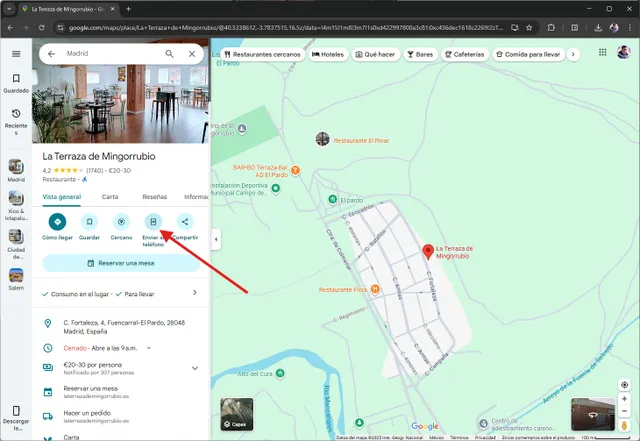 Enviar ubicaciones del ordenador al móvil: Si estás preparando una ruta en el ordenador, no hace falta que vuelvas a buscarla desde el móvil, puedes enviártela directamente. Tras seleccionar una ubicación, haz clic en el botón del teléfono que aparece a la izquierda, te permitirá mandarte esa información como notificación o correo a cualquiera de tus dispositivos con la misma cuenta de Google.