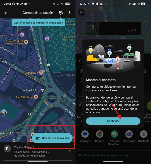Compartir ubicación en tiempo real: Una de las herramientas más prácticas para facilitar encuentros o reforzar tu seguridad, puedes compartir tu ubicación exacta con alguien durante el tiempo que elijas. Entra en tu perfil, pulsa Compartir ubicación y selecciona con quién y durante cuánto tiempo. Quien lo reciba podrá ver tu recorrido en directo y, además, el nivel de batería de tu dispositivo.