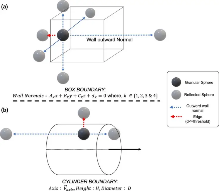 Imagen: Esquema de las condiciones de contorno utilizadas en las simulaciones: arriba, partículas dentro de una caja con normales salientes en cada pared; abajo, sistema granular en un cilindro rotatorio. Las flechas indican la dirección de las fuerzas y las reflexiones en los límites. Fuente: Nature Communications