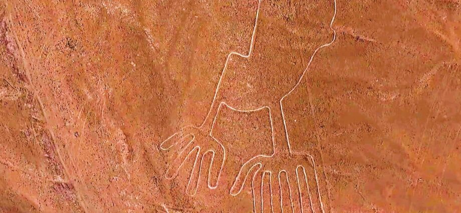 Vista aérea de un geoglifo de las Líneas de Nazca con figura antropomorfa y manos grandes trazadas sobre el desierto.