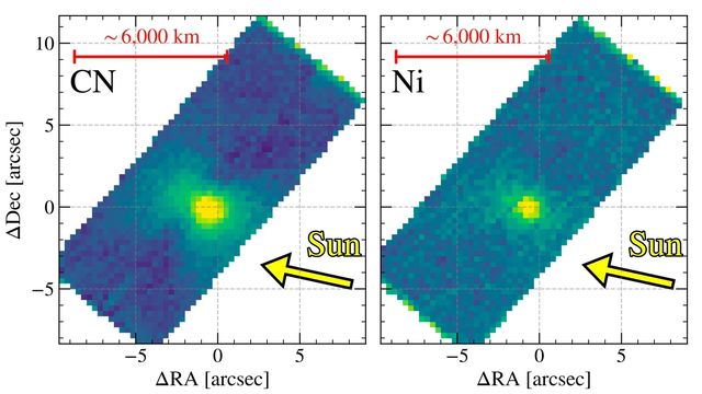 Una imagen de banda estrecha del KCWI de 3I/ATLAS en emisión de níquel (Ni) y cianuro (CN) en los intervalos de longitud de onda de 0,3865–0,3885 y 0,3605–0,3625 micrómetros respectivamente, muestra una concentración central de níquel en relación con el cianuro. Las emisiones de la columna de gas circundante se extienden hasta un radio exponencial de 600 kilómetros para el níquel y 840 kilómetros para el cianuro. Al describir otra anomalía, los autores afirman que «la tasa de producción de níquel en relación con el cianuro es mayor que en 2I/Borisov y varios órdenes de magnitud por encima de la mediana de los cometas del sistema solar».