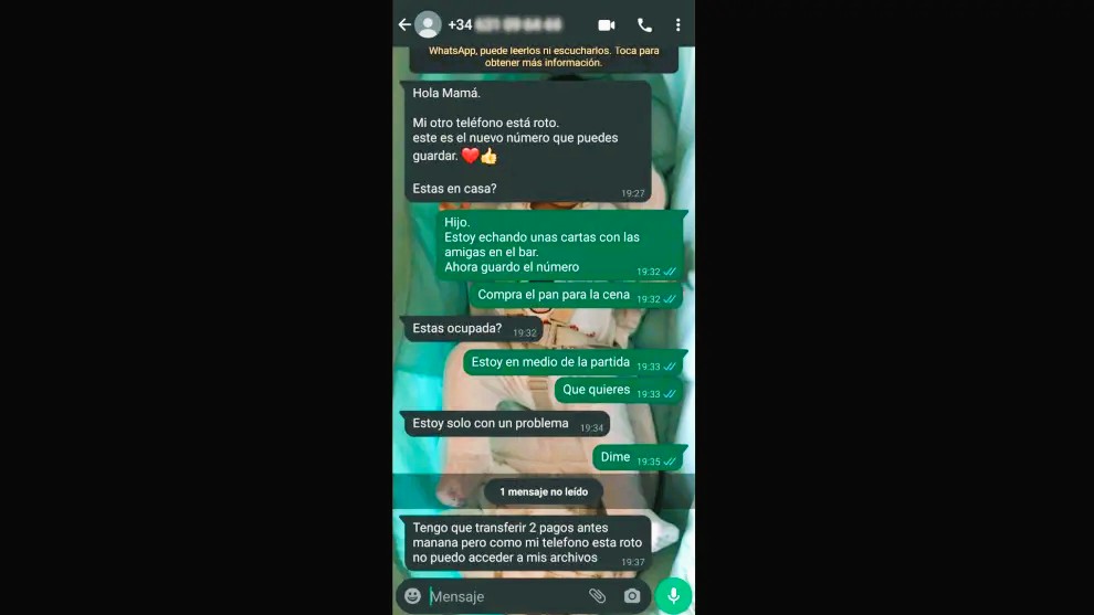 Tal y como explicó la Policía Nacional el año pasado en un vídeo de TikTok, un ejemplo de mensaje podría ser: “Hola papa, mi teléfono se cayó al agua y mi tarjeta SIM también está rota. Este es el nuevo número, envíame un mensaje a través de WhatsApp”.